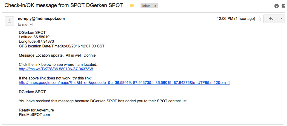 email received from the spot device with active links to imagery showing the device location when the message was sent.